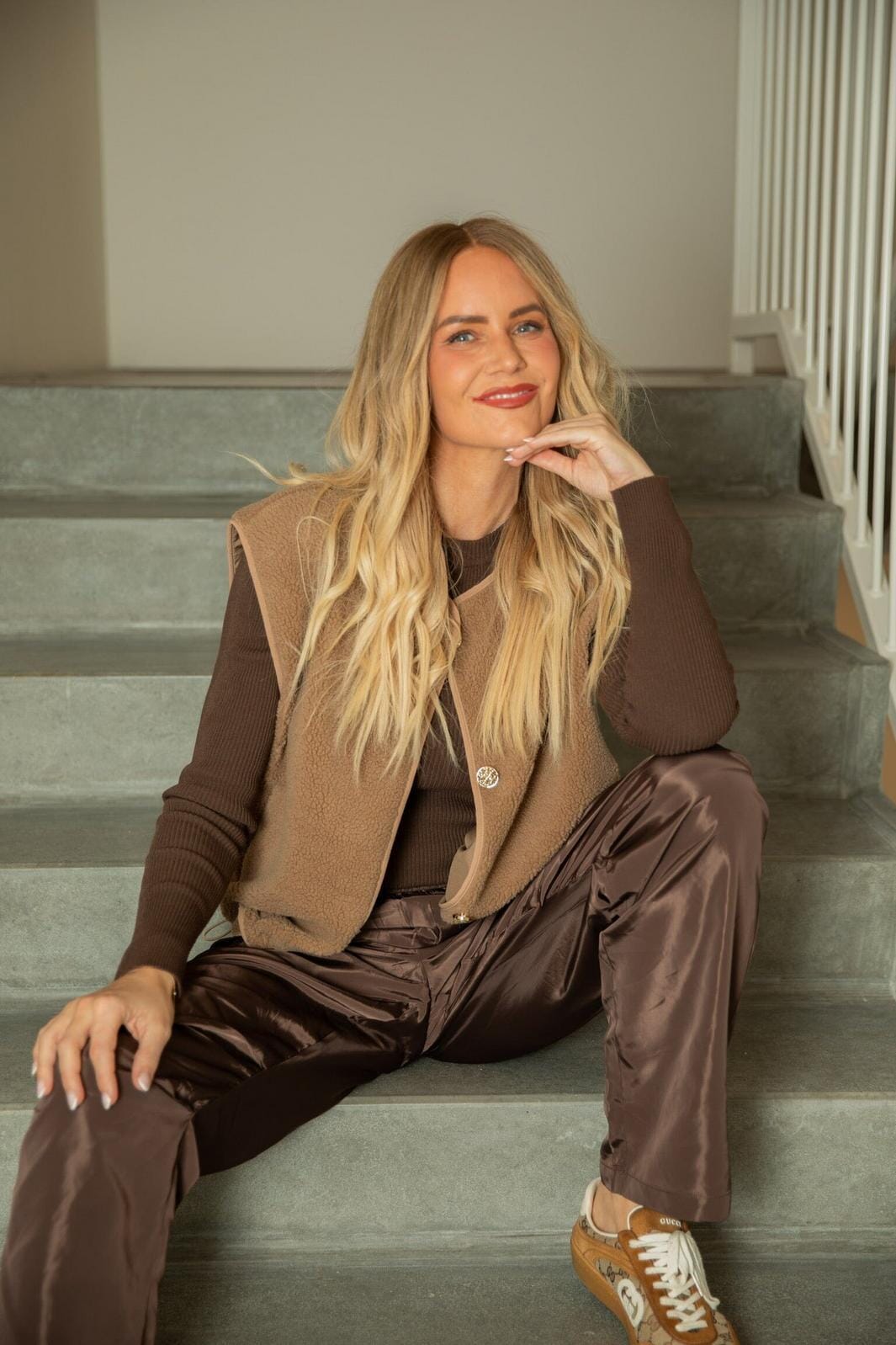 Flauschige Weste von Valentin Studio in einem dunklen Sandton. Die Weste hat ein ärmelloses Design mit Rundhalsausschnitt und besteht aus 100 % Polyester.