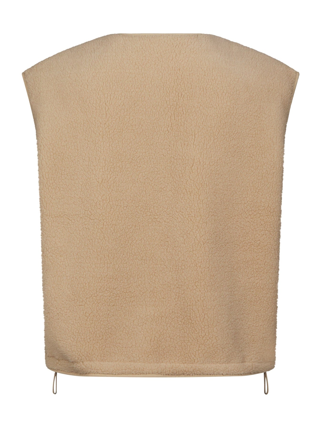 Sandfarbene flauschige Weste von Valentin Studio. Sie hat einen Knopfverschluss vorne und ein ärmelloses Design mit rundem Halsausschnitt.