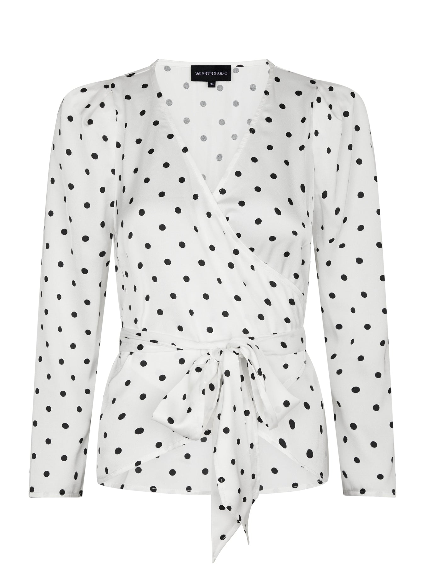 Weiße Bluse von Valentin Studio mit schwarzen Punkten. Die Bluse hat lange Ärmel, einen V-Ausschnitt und ein Bindeband vorne.