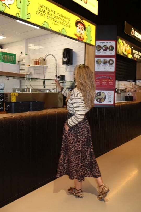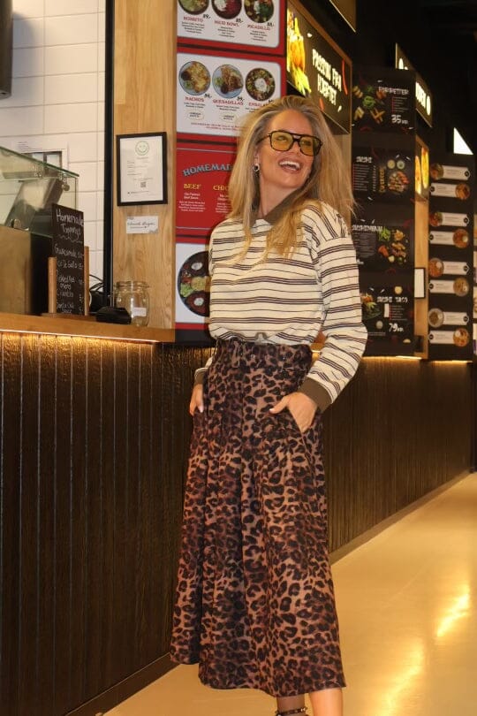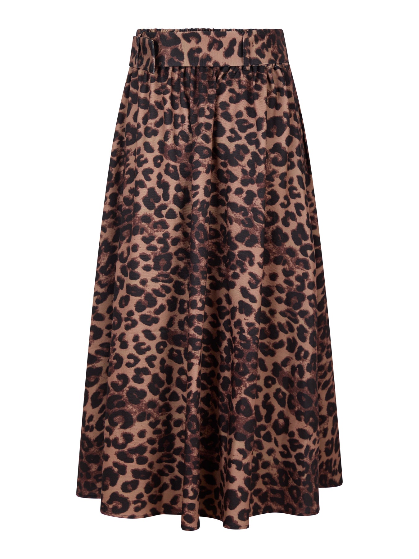 Faltenrock von Valentin Studio mit braunem Leopardenmuster. Der Rock hat eine hohe Taille und reicht bis zur Mitte der Wade mit einem sanften Fall des Stoffes.
