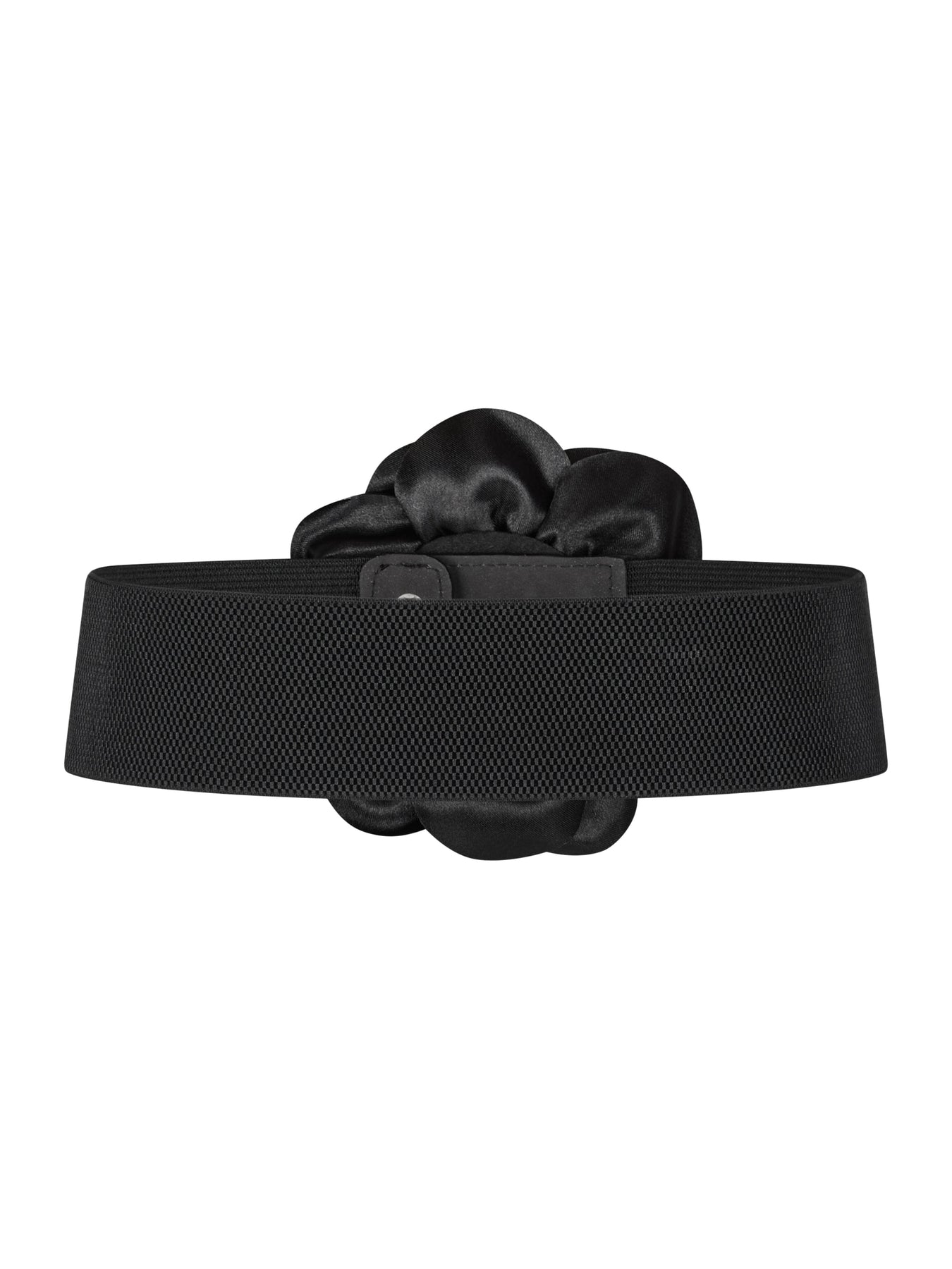Schwarzer Gürtel von Valentin Studio mit einer großen rosenähnlichen Verzierung vorne. Der Gürtel hat ein breites Design und eine schwarze Farbe, die es einfach macht, ihn zu verschiedenen Outfits zu stylen.