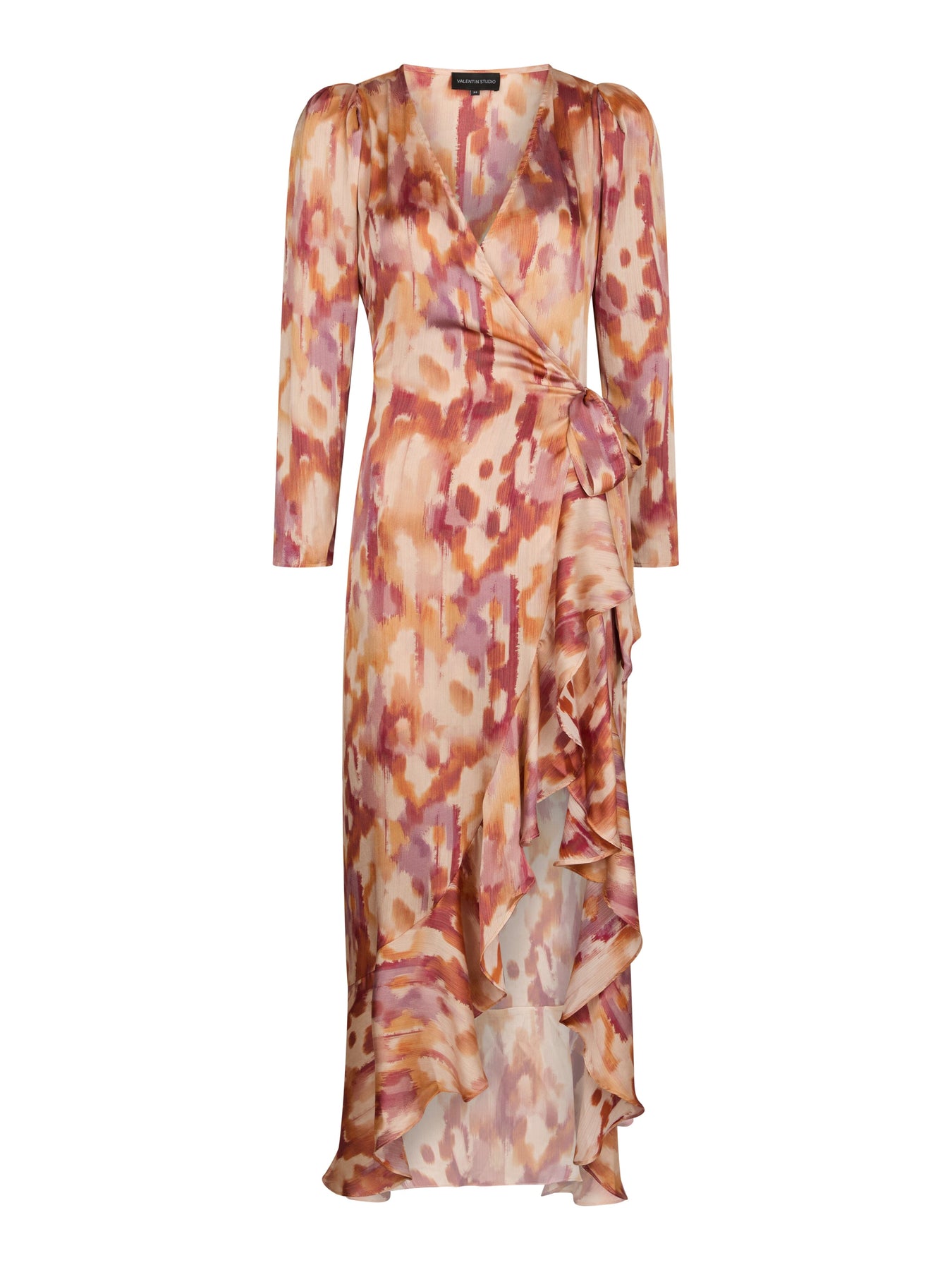 Kleid von Valentin Studio, aus 100 % Polyester in einem burnt-orange Farbton. Dieses Kleid hat ein verschwommenes Muster in Nuancen von Rot, Orange und Lila.