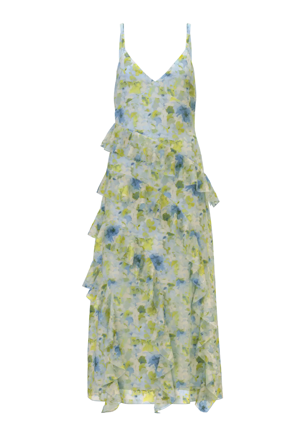 Langes Kleid von Vero Moda mit Blumenprint in grünen und blauen Nuancen. Das Kleid hat mehrlagige Volantdetails und dünne Träger.