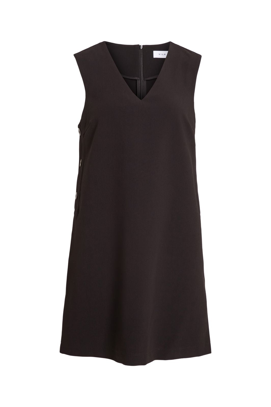 Schwarzes Kleid von Vila mit Slim-Fit-Passform. Das ärmellose Kleid hat einen V-Ausschnitt und praktische Details wie einen Reißverschluss hinten und Knöpfe an der Seite.