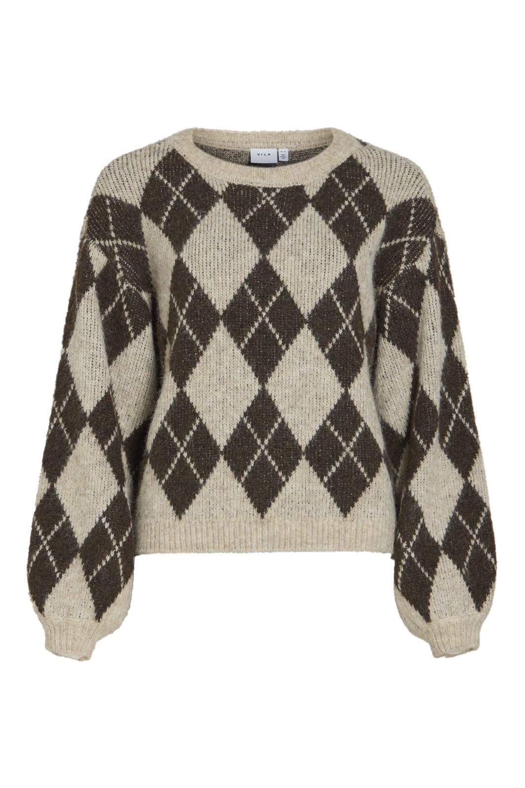 Strickpullover von Vila mit Argyle-Muster in Dunkelbraun und Beige. Der Pullover hat einen runden Halsausschnitt und lange Ärmel mit leicht gepuffter Form.