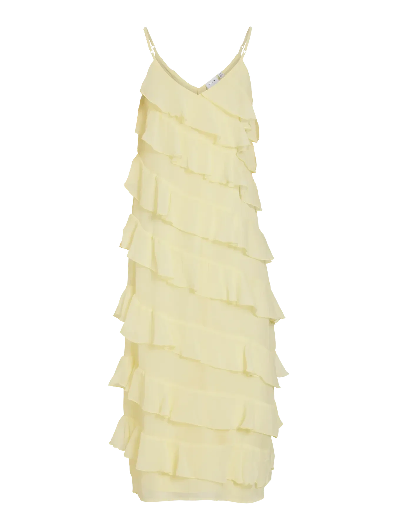 Knöchellanges Kleid von Vila in Pastellgelb. Das Kleid hat dünne Träger und einen V-Ausschnitt. Es ist mit mehreren Lagen Rüschen gefertigt, die diagonal über das Kleid verlaufen.