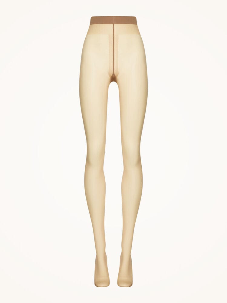 Strumpfhosen von Wolford in karamellfarbener Nuance mit matter Puderfinish. Die dünnen Strumpfhosen haben einen Denier-Wert von 8, was eine leichte und natürliche Optik ergibt.