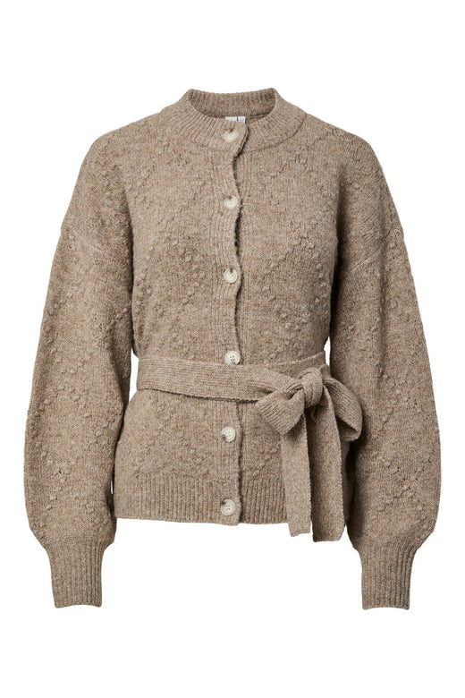 Gestrickte Strickjacke von Y.A.S in braunen und beigen Tönen. Sie hat einen Rundhalsausschnitt, eine Knopfleiste vorne und einen gestrickten Gürtel in der Taille.