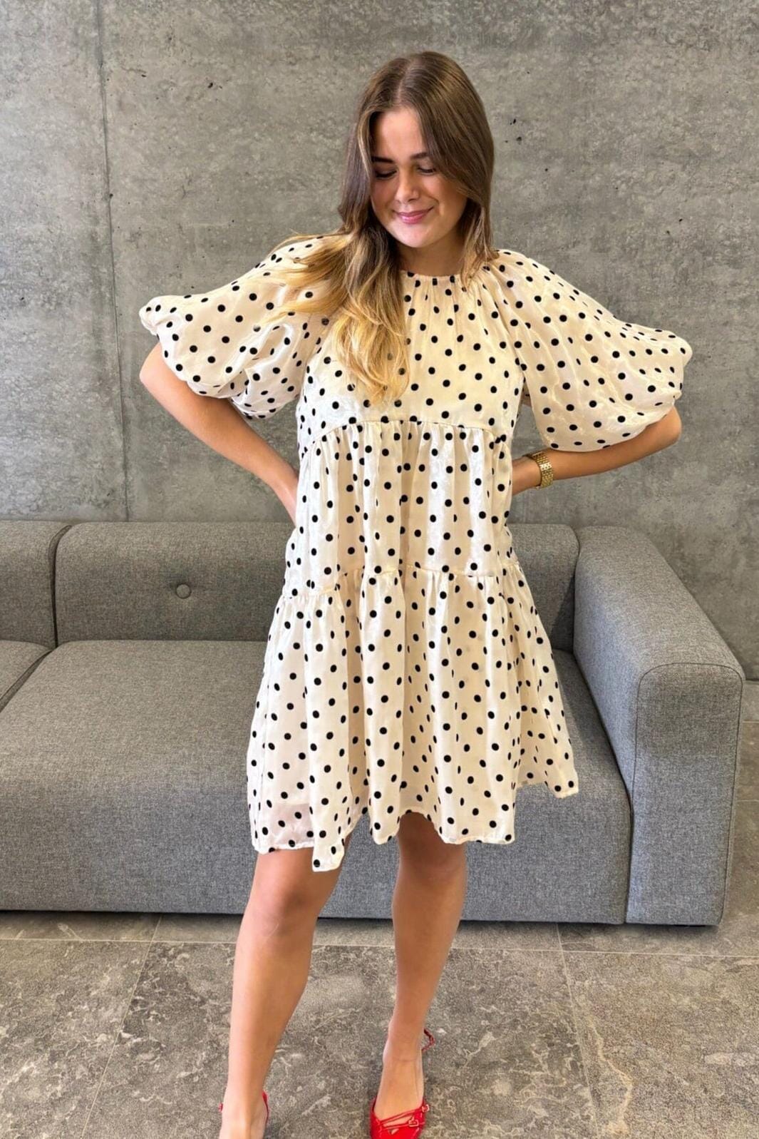 Beige Kleid von Y. A.S mit schwarzen Punkten. Es hat eine lockere Passform mit Puffärmeln und Rundhalsausschnitt. Das Kleid ist knielang mit Rüschen und Bindebändern, die ein geschichtetes Design schaffen.