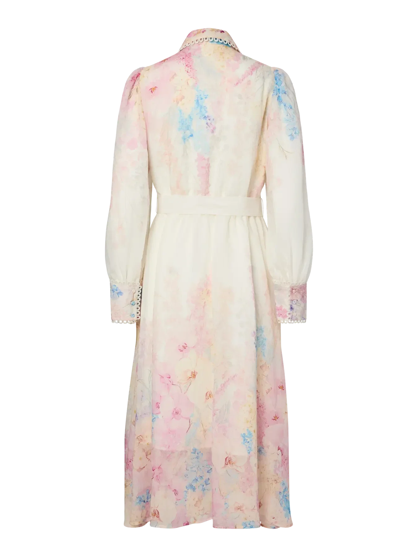 Langes Kleid von YAS mit Blumenprint in Pastellnuancen von Rosa und Blau auf cremeweißem Untergrund. Das Kleid hat lange Ärmel und einen Gürtel in der Taille.