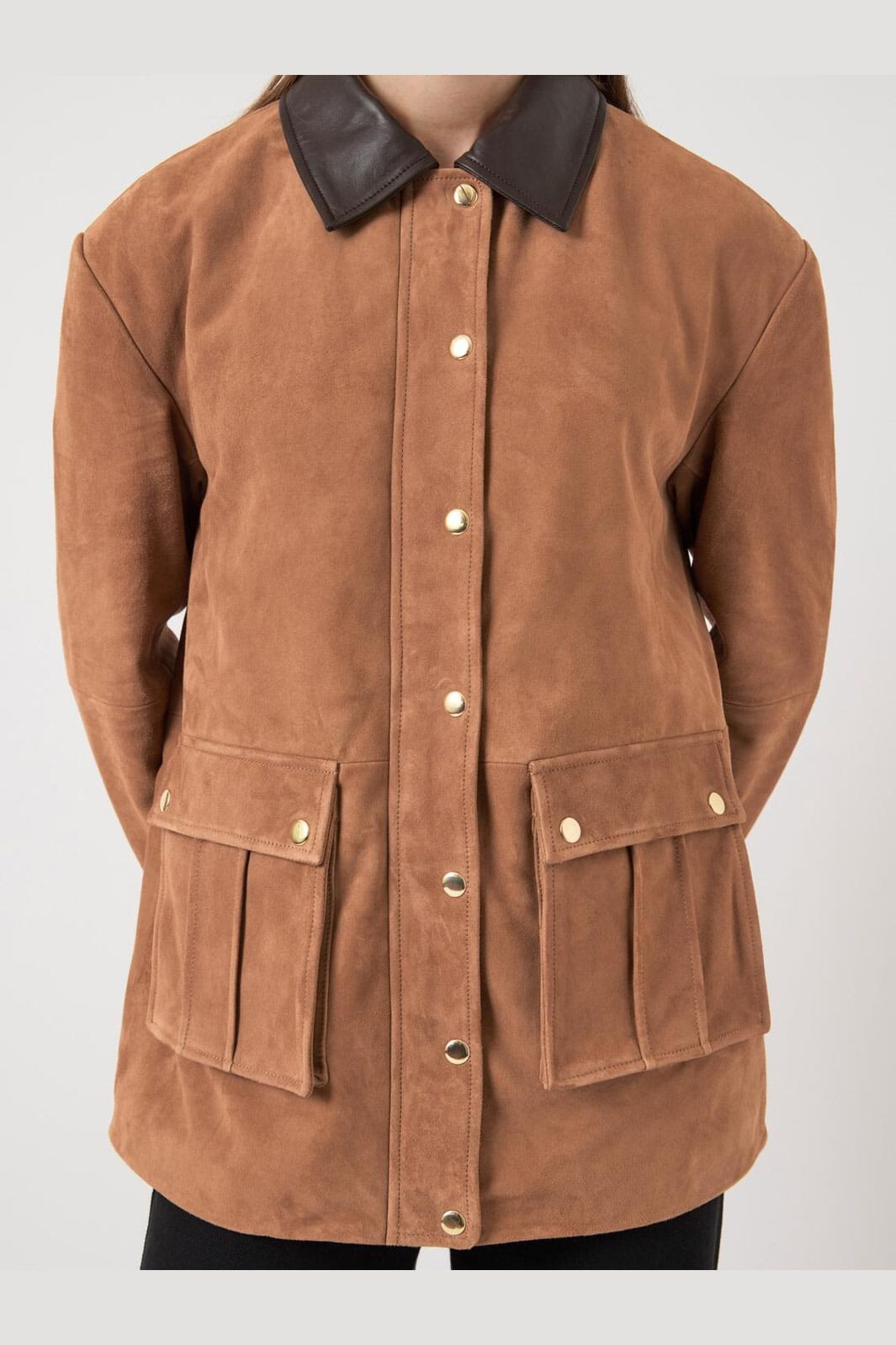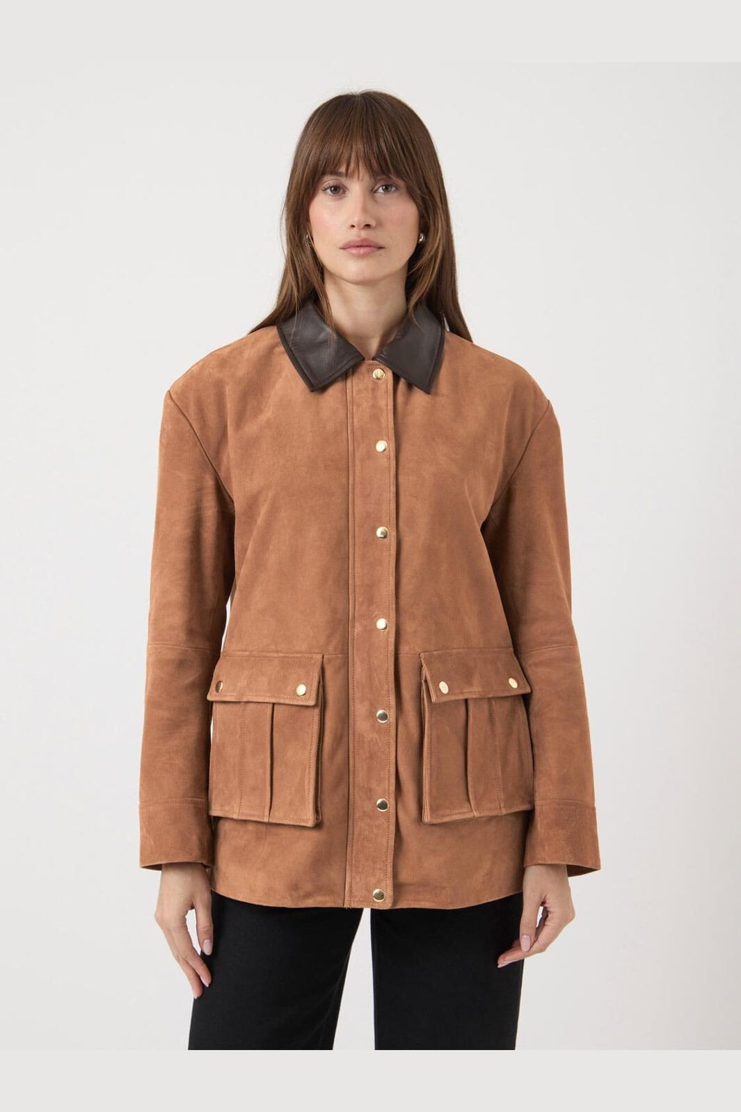 Braune Lederjacke von Y. A.S mit schwarzem Kontrastkragen. Die Jacke ist aus Lammleder, einem Nebenprodukt der Lebensmittelindustrie, gefertigt und hat praktische Druckknöpfe vorne.