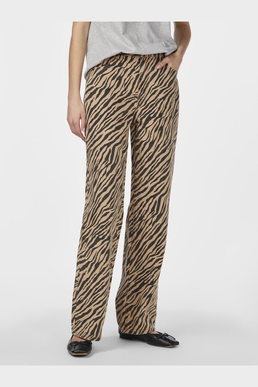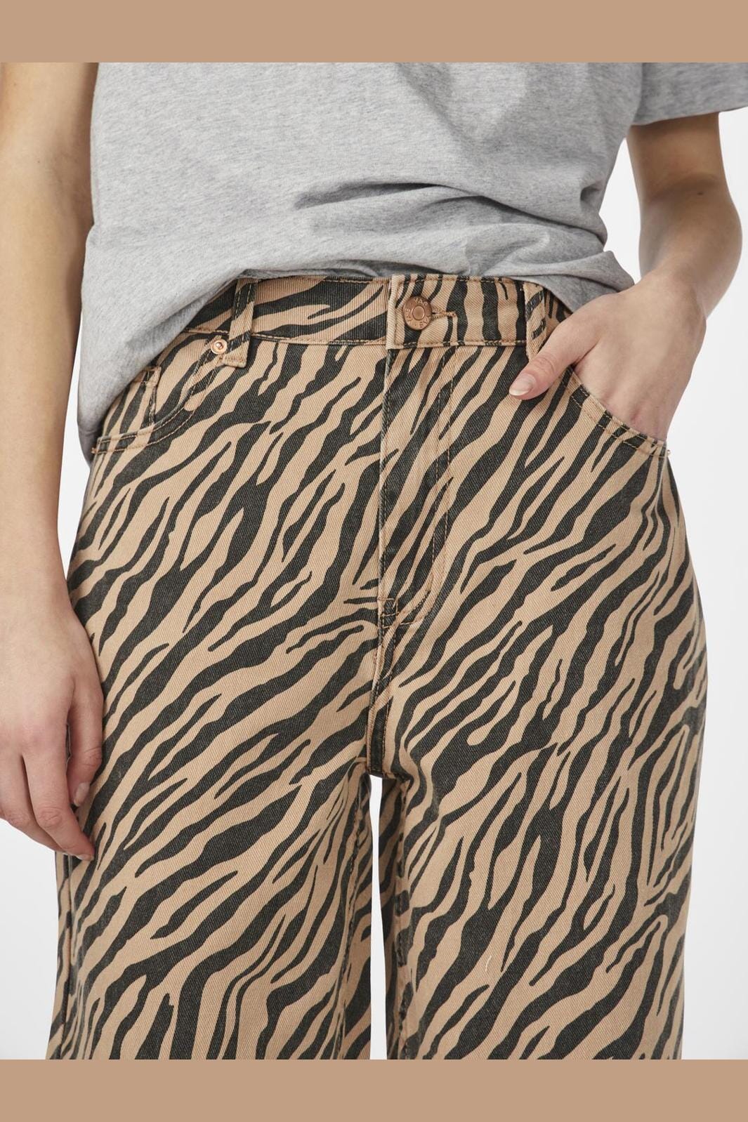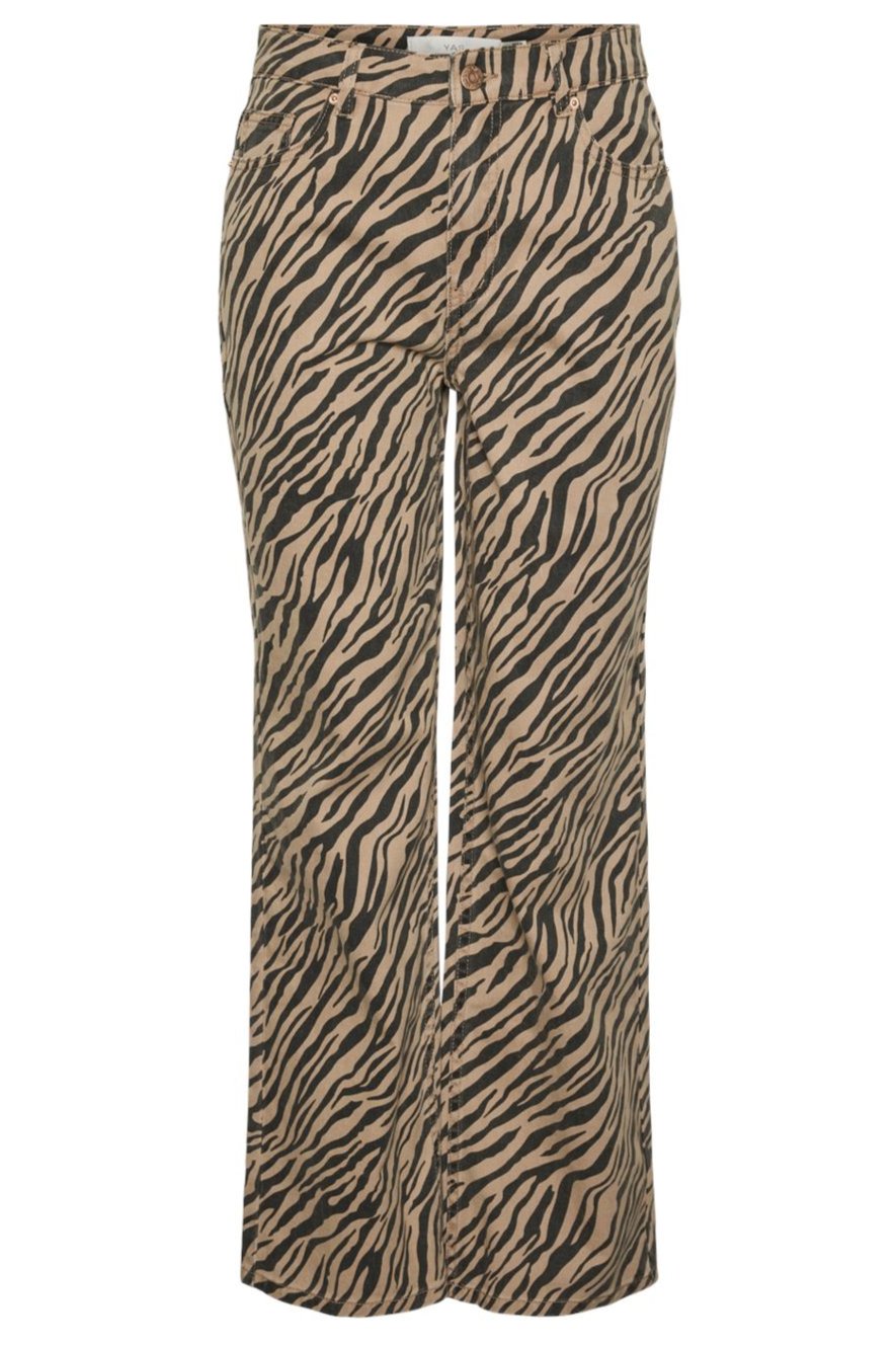 Jeans von Y.A.S mit tigerstreifigem Muster in Beige und Schwarz. Die Hose hat eine hohe Taille und Bodenlänge mit Regular Fit.