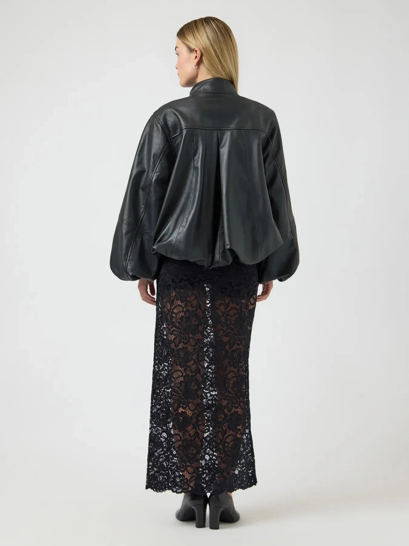 Schwarze Lederjacke von YAS, gefertigt aus 100 % Leder. Die Jacke hat einen hohen Kragen und voluminöse Ärmel mit leichter Raffung an den Bündchen.