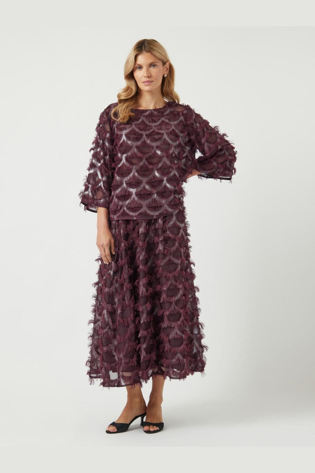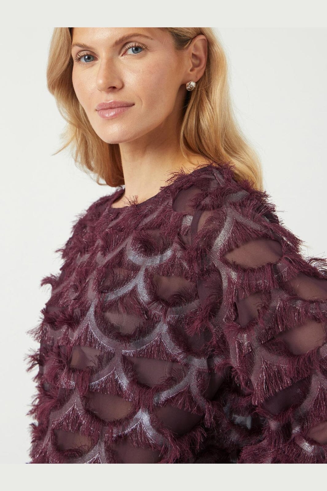 Top von YAS, hergestellt aus 100 % Polyester in einem bordeauxroten Farbton mit metallischem Glanz. Die Top hat ein Muster aus Halbkreisen mit Fransen.