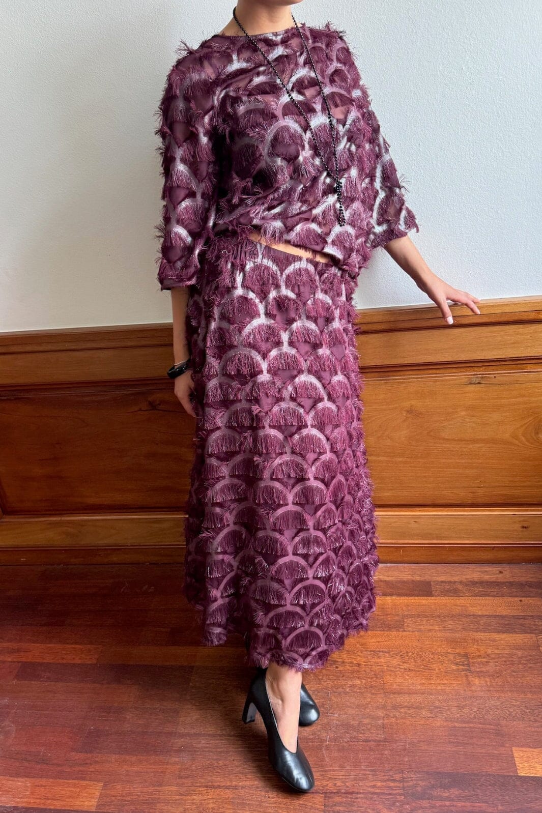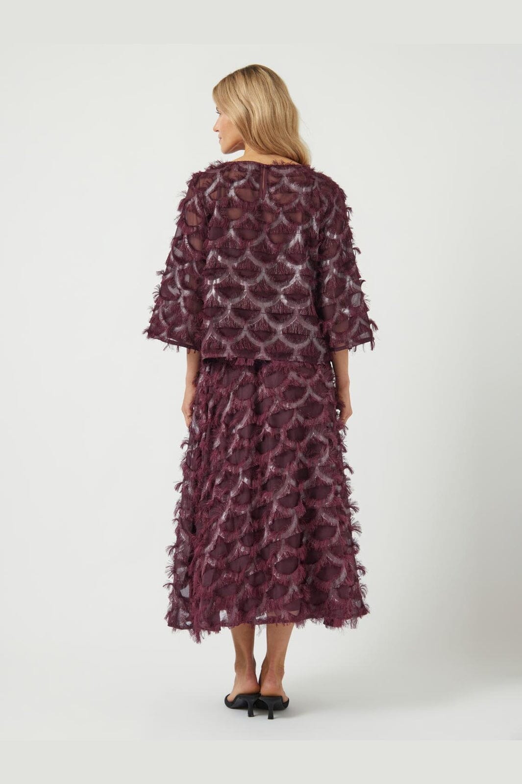 Top von YAS, hergestellt aus 100 % Polyester in einem bordeauxroten Farbton mit metallischem Glanz. Die Top hat ein Muster aus Halbkreisen mit Fransen.
