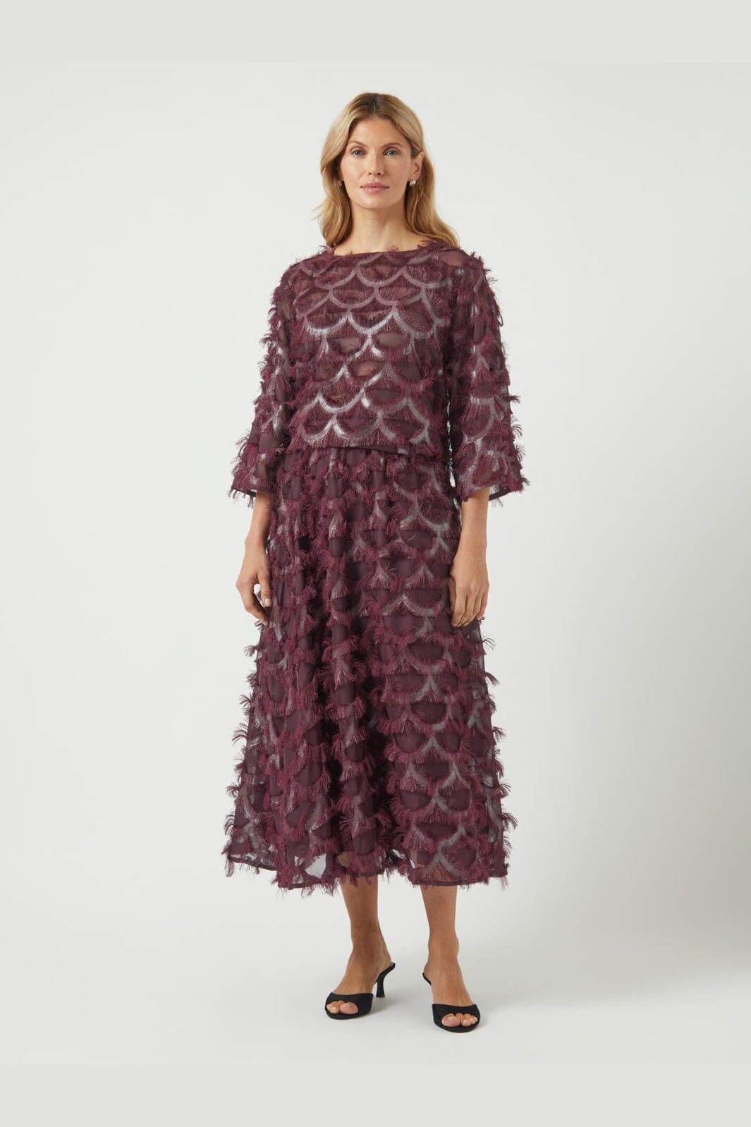 Rock von YAS, aus 100 % Polyester in einem tiefen burgunderroten Farbton mit metallischem Druck und Fransen auf der gesamten Oberfläche.