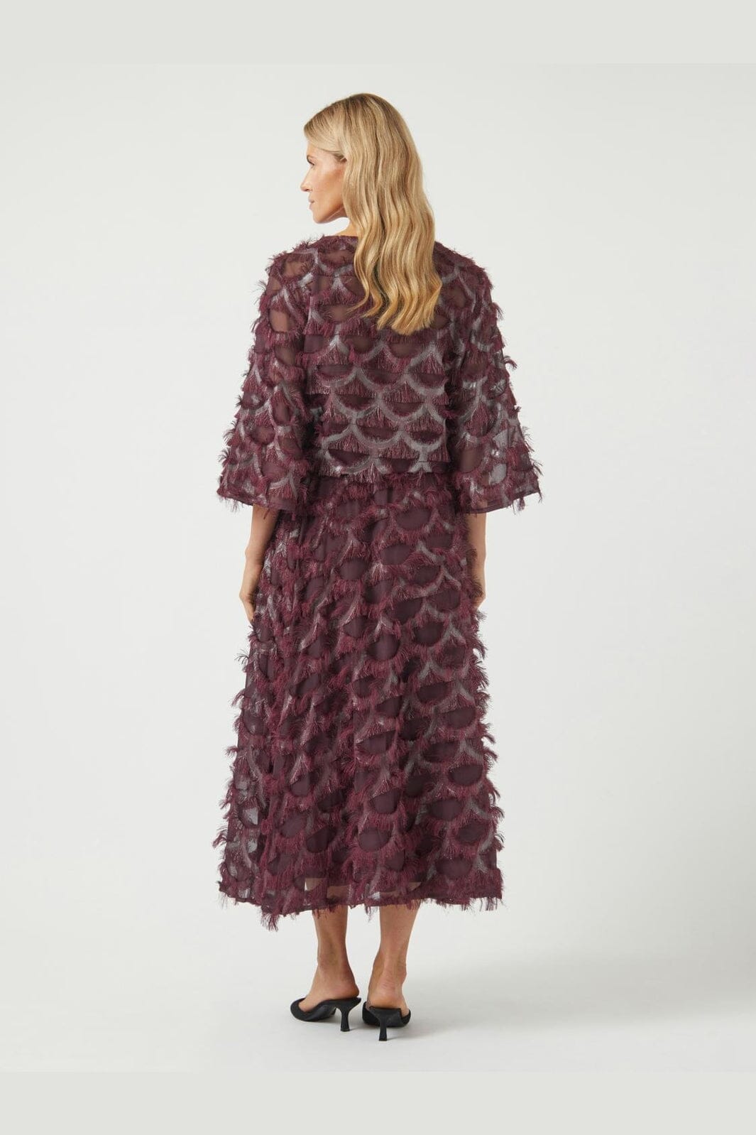 Rock von YAS, hergestellt aus 100 % Polyester in einem tiefen burgunderroten Farbton mit metallischem Print und Fransen über die gesamte Oberfläche.