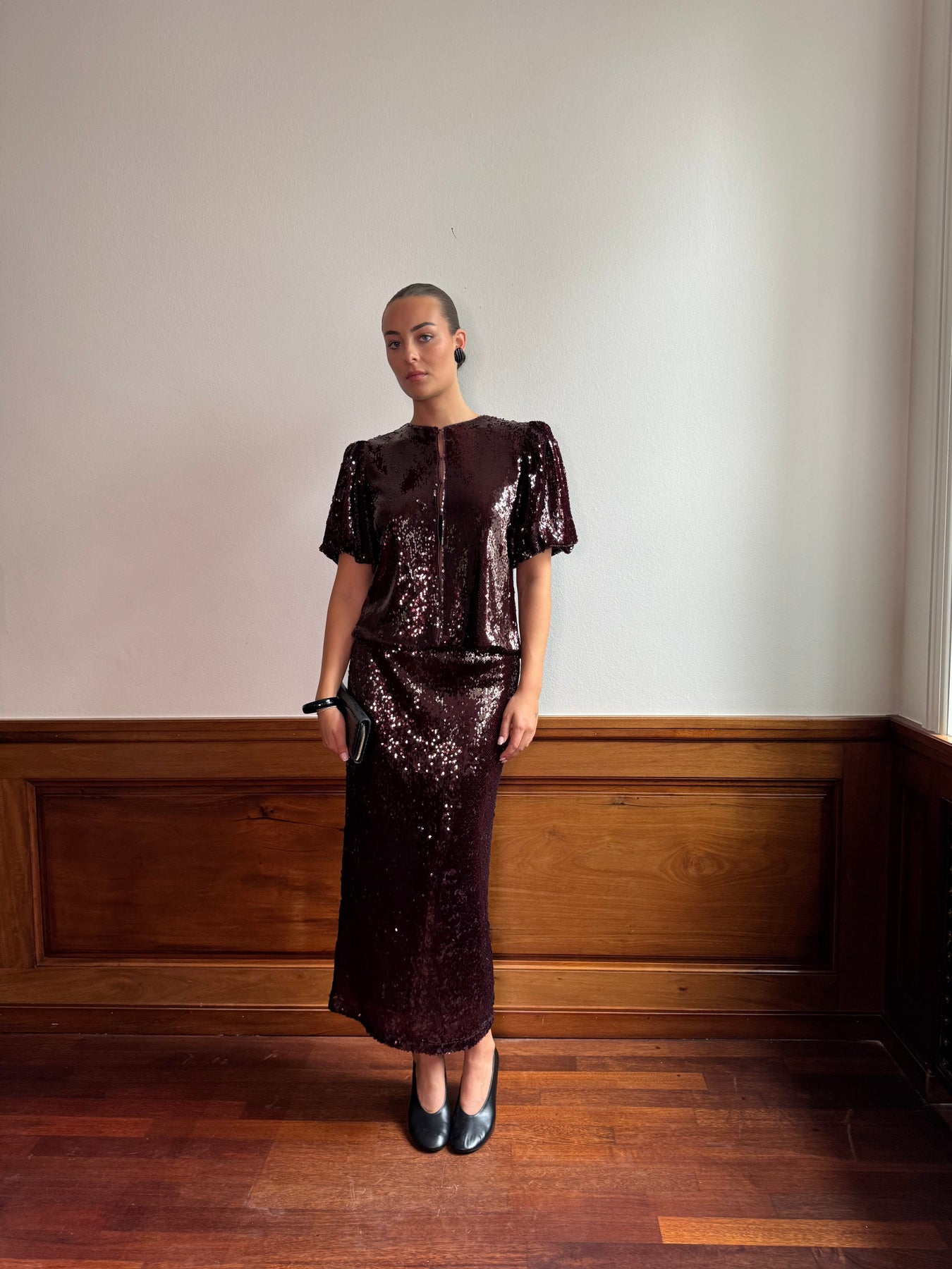 Knöchellanger Rock von YAS, bedeckt mit Pailletten in einem tiefen Burgunderrot. Der Rock ist aus 100% Polyester gefertigt.